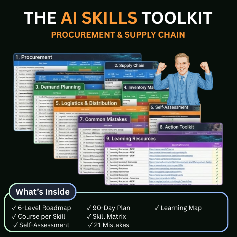 The complete AI skills roadmap for procurement and supply chain professionals. 10 Excel sheets covering 150+ skills, 48+ courses, 26 ready-to-use prompts, self-assessment tools, and a 90-day action plan.